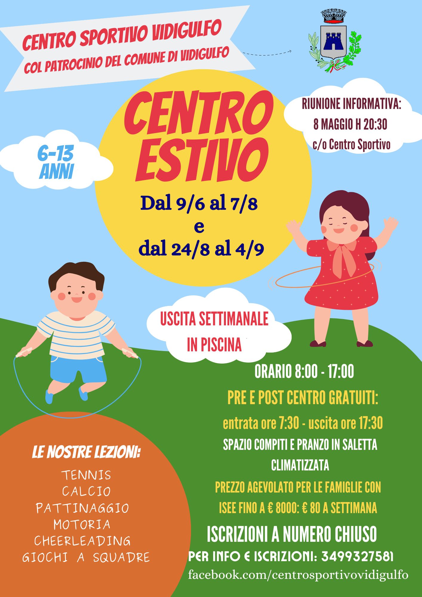 Si comunica alla cittadinanza che l'8 maggio alle ore 20:30 presso il centro sportivo di Vidigulfo ci sarà la riunione informativa del Centro estivo 2026 per i bambini dai 6 ai 13 anni.