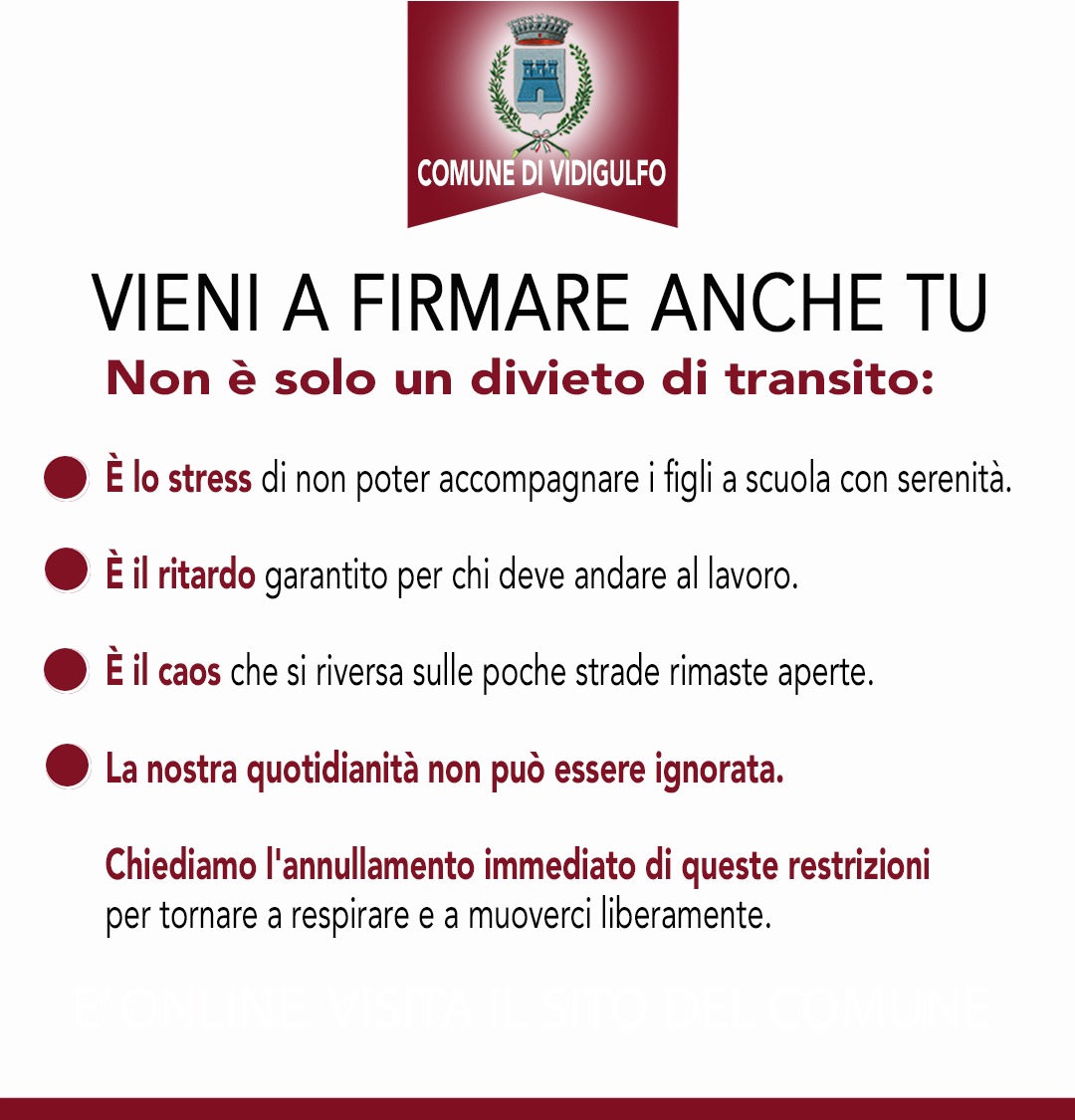 l Consiglio Comunale di Vidigulfo invita tutta la popolazione a partecipare attivamente firmando la petizione per la richiesta di annullamento delle ordinanze n. 71 e n. 72 del 21/11/2025. emesse dal Responsabile del Settore Vigilanza e Controllo del Territorio del Comune di Siziano che stanno paralizzando la viabilità nella fascia oraria dalle 7.15 alle 8.45, con ricadute significative sulla vita quotidiana dei cittadini.
